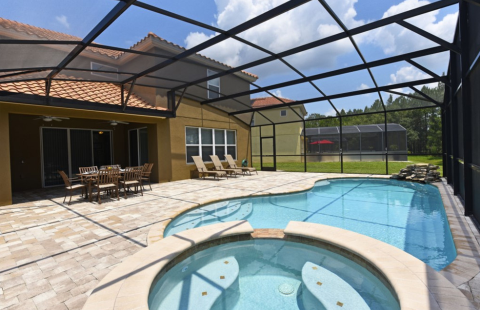 Fuera, se destacan una piscina totalmente cubierta, una piscina privada con derrame y un lanai cubierto con una mesa y sillas para una cena fresca.